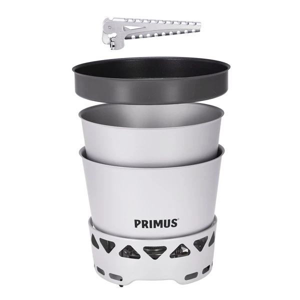 Brennstoffsparendes Kochset für 1-2 Personen. Die beiden 2,3 l Töpfe lassen sich ineinander stapeln und fassen anschließend den Brenner und die Griffzange. So kann alles kompakt verstaut werden.