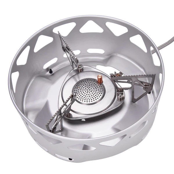 Der Kocher ist im Windschutz integriert und ist somit schnell einsatzbereit. Einfach aufstellen, Gaskartusche anschrauben und los geht das Vergnügen. Auf dem Windschutz stehen die Töpfe sicher und kippstabil.