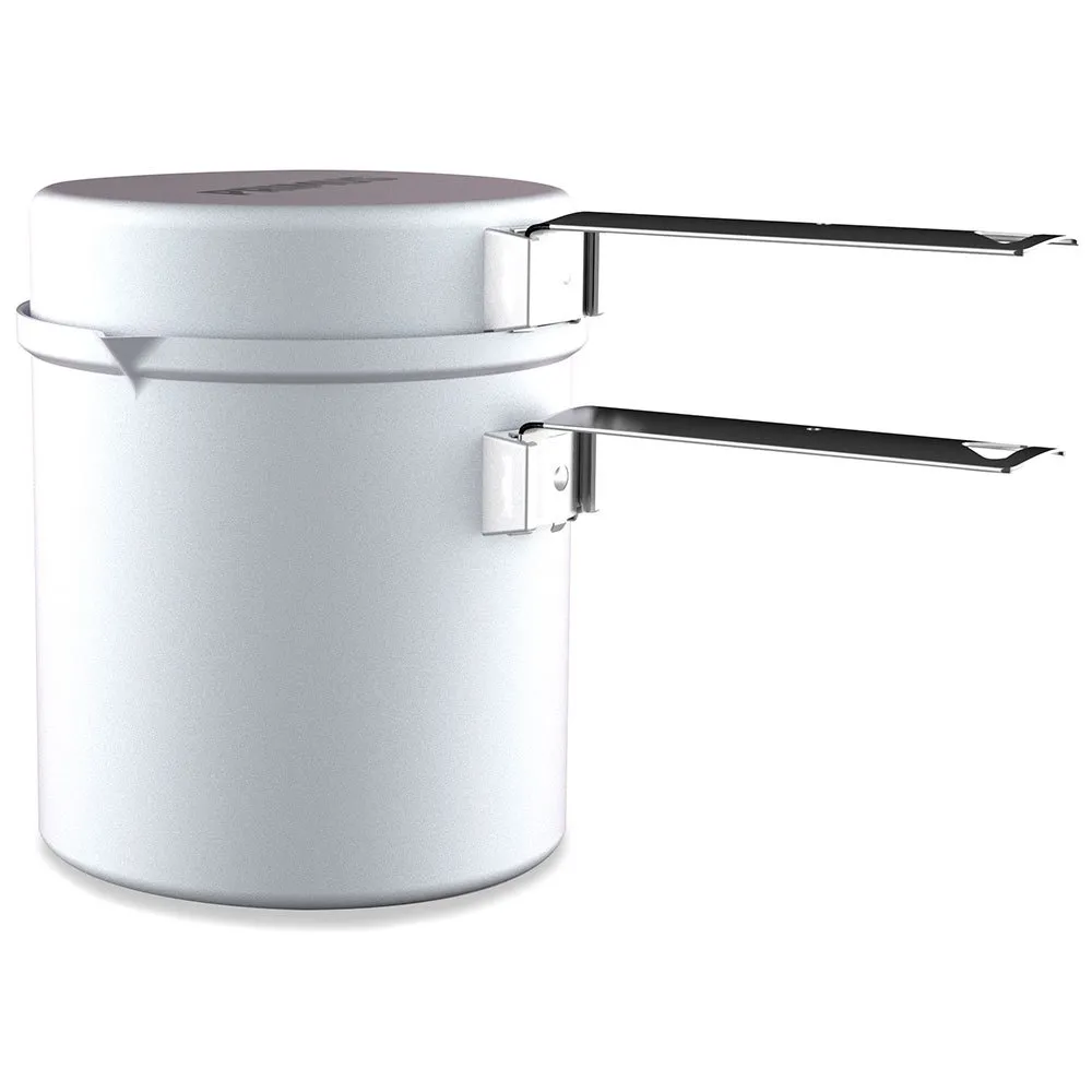 Das Trek Pot Set enthält den Trek Pot 0.6l und den Trek Pot 1.0l. Zwei verschiedene Topfgrößen plus eine Pfanne, alle aus hart eloxiertem Aluminium mit einer keramischen Antihaftbeschichtung. Dieser kleine Topf enthält einen Deckel aus Kunststoff und ist mit einem Sieb und einem Silikongriff ausgestattet.